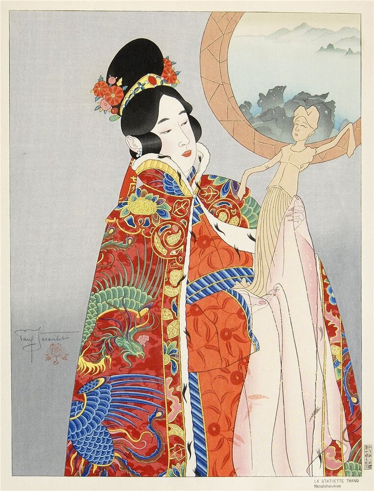 Nous vous proposons une reproduction artisanale sur toile du célèbre tableau 'La Statuetta Thang. Mandchoukuo' de Paul Jacoulet, provenant du Musée de la Reproduction.