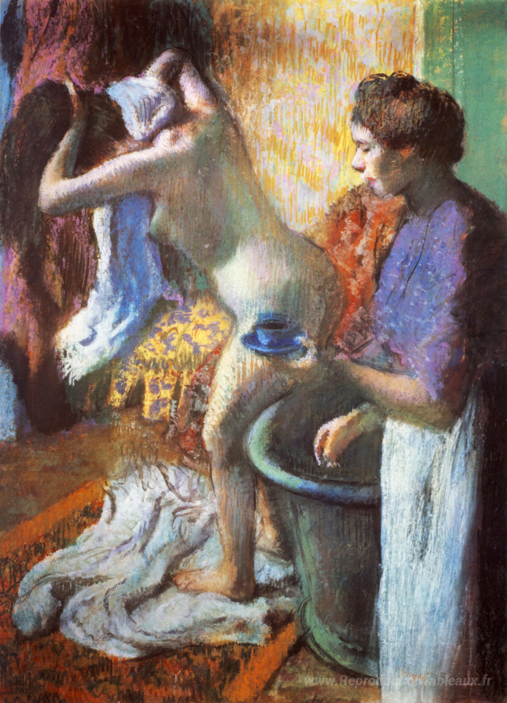 Nous vous proposons une reproduction artisanale sur toile du célèbre tableau 'La tasse de thé (petit-déjeuner après le bain)' de Edgar Degas, provenant du Musée de la Reproduction.