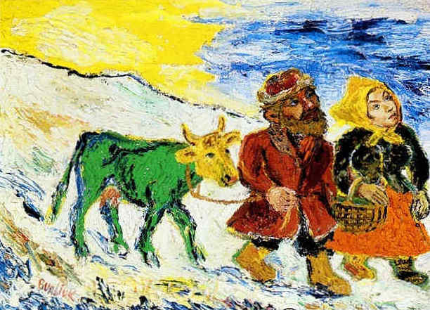Nous vous proposons une reproduction artisanale sur toile du célèbre tableau 'La vache verte' de David Burliuk, provenant du Musée de la Reproduction.