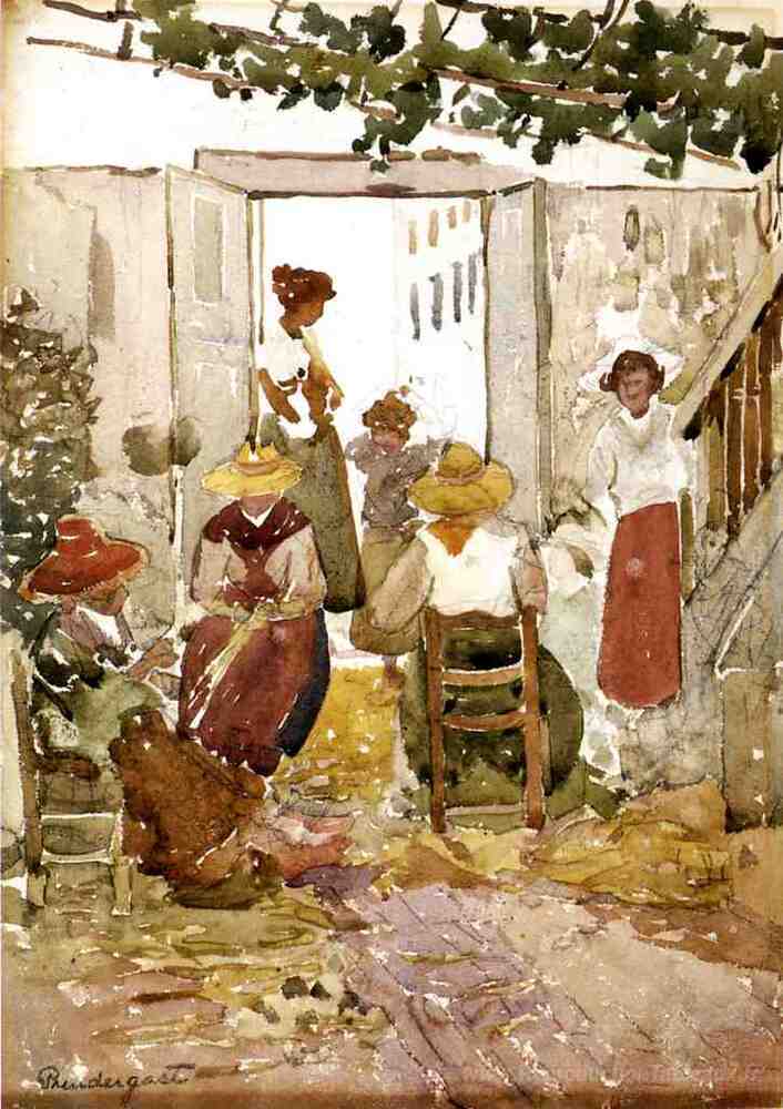 Nous vous proposons une reproduction artisanale sur toile du célèbre tableau 'Lacemakers, Venise' de Maurice Prendergast, provenant du Musée de la Reproduction.