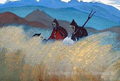 Nous vous proposons une reproduction artisanale sur toile du célèbre tableau 'Lamas-Rapers' de Nicholas Roerich, provenant du Musée de la Reproduction.