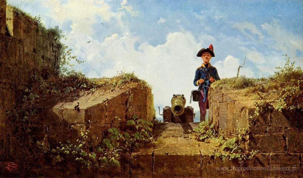 Nous vous proposons une reproduction artisanale sur toile du célèbre tableau 'L'avant-poste de tricotage' de Carl Spitzweg, provenant du Musée de la Reproduction.
