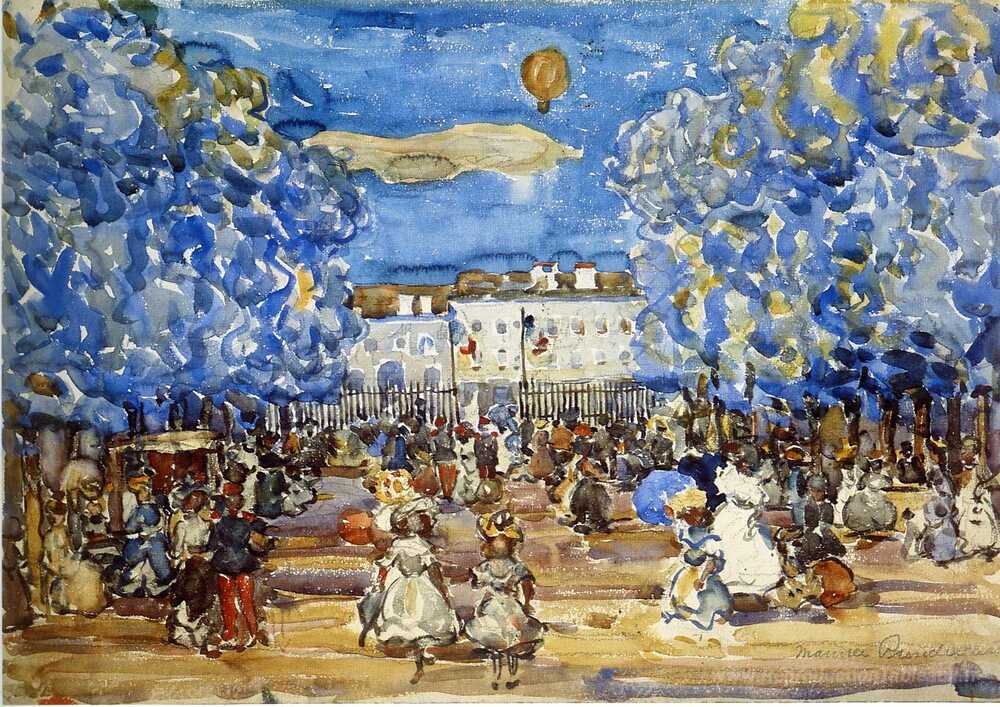 Nous vous proposons une reproduction artisanale sur toile du célèbre tableau 'Le ballon' de Maurice Prendergast, provenant du Musée de la Reproduction.