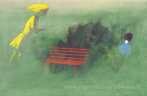 Nous vous proposons une reproduction artisanale sur toile du célèbre tableau 'Le banc rouge du parc' de Charles Blackman, provenant du Musée de la Reproduction.