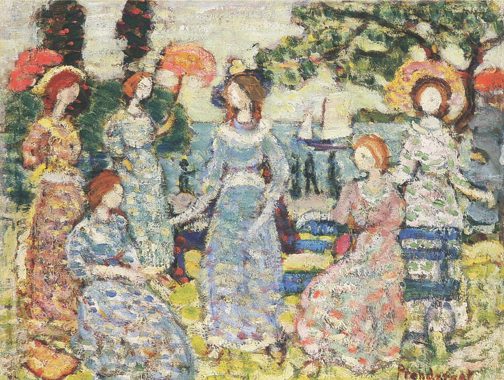 Nous vous proposons une reproduction artisanale sur toile du célèbre tableau 'Le bosquet' de Maurice Prendergast, provenant du Musée de la Reproduction.