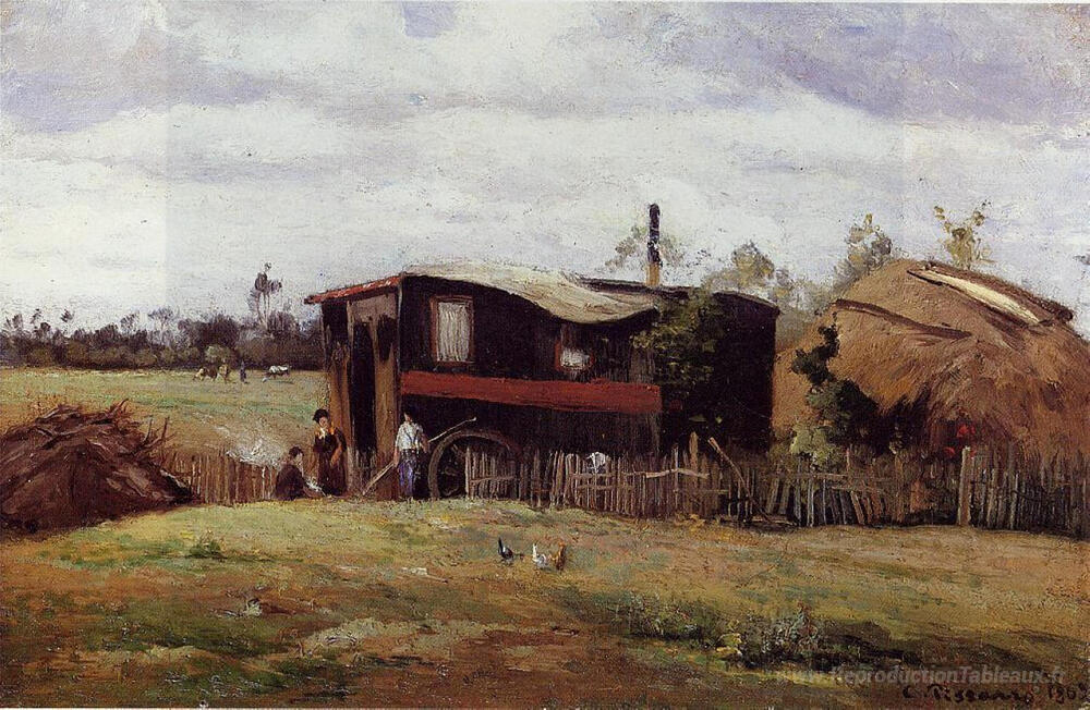 Nous vous proposons une reproduction artisanale sur toile du célèbre tableau 'Le chariot bohème' de Camille Pissarro, provenant du Musée de la Reproduction.