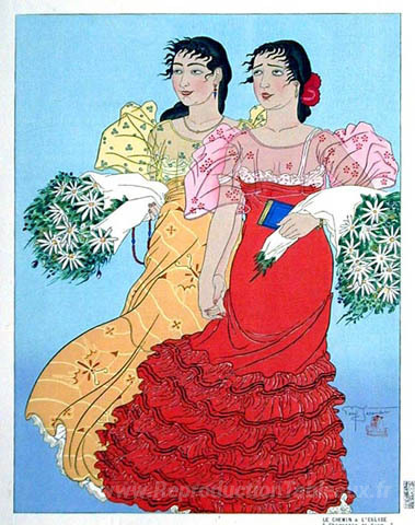Nous vous proposons une reproduction artisanale sur toile du célèbre tableau 'Le Chemin A L'Eglise. Chamorro De Guam' de Paul Jacoulet, provenant du Musée de la Reproduction.