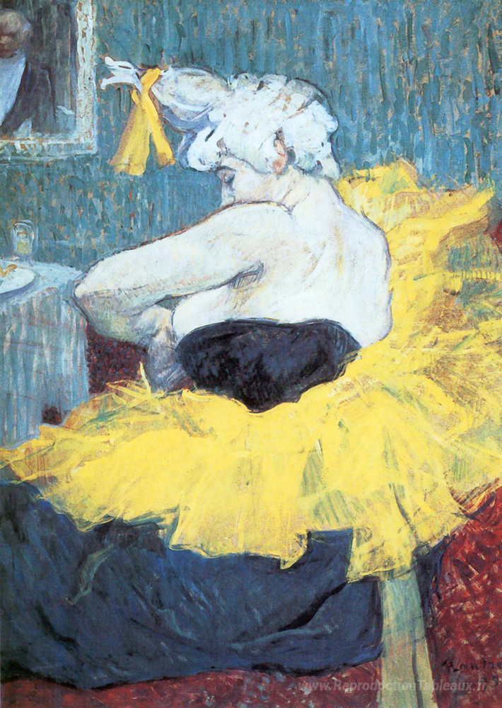 Nous vous proposons une reproduction artisanale sur toile du célèbre tableau 'Le clownesse cha u kao au Moulin Rouge' de Henri de Toulouse-Lautrec, provenant du Musée de la Reproduction.