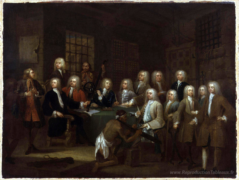 Nous vous proposons une reproduction artisanale sur toile du célèbre tableau 'Le comité des prisons de la Chambre des communes' de William Hogarth, provenant du Musée de la Reproduction.