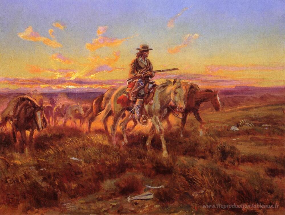 Nous vous proposons une reproduction artisanale sur toile du célèbre tableau 'Le commerçant libre' de Charles M. Russell, provenant du Musée de la Reproduction.