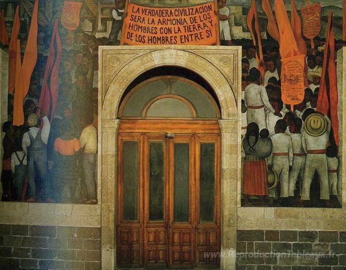 Nous vous proposons une reproduction artisanale sur toile du célèbre tableau 'Le festival du premier mai' de Diego Rivera, provenant du Musée de la Reproduction.