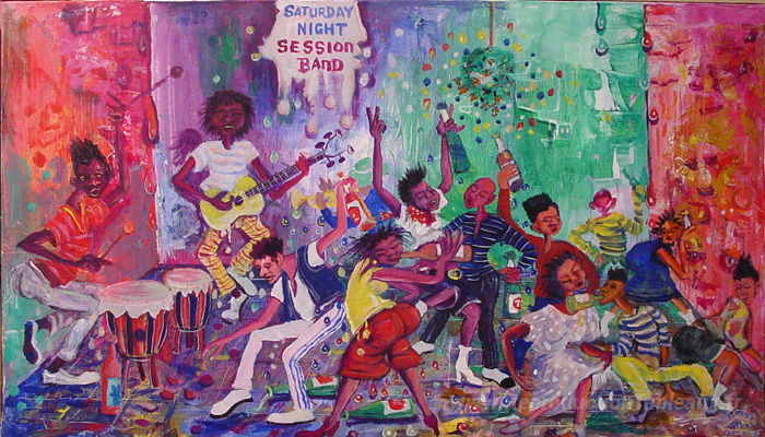 Nous vous proposons une reproduction artisanale sur toile du célèbre tableau 'Le groupe de session du samedi soir' de Nzante Spee, provenant du Musée de la Reproduction.