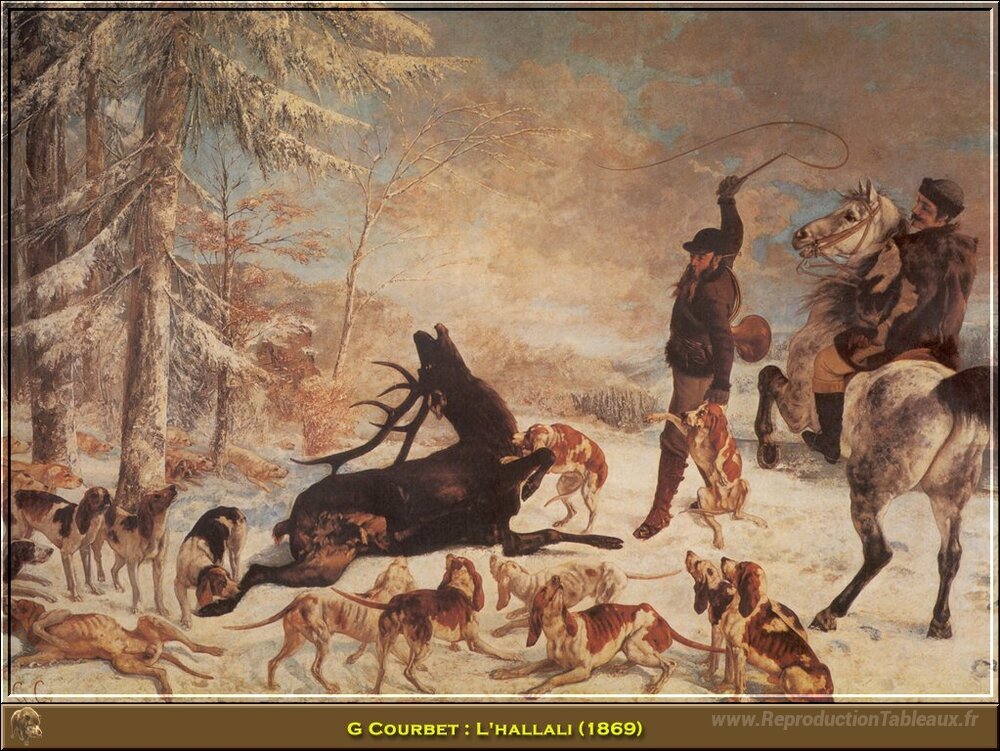 Nous vous proposons une reproduction artisanale sur toile du célèbre tableau 'Le hallali' de Gustave Courbet, provenant du Musée de la Reproduction.