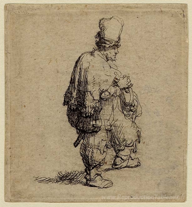 Nous vous proposons une reproduction artisanale sur toile du célèbre tableau 'Le joueur d'orgue de baril (Polander debout avec les bras replié' de Rembrandt, provenant du Musée de la Reproduction.