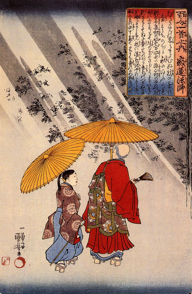 Nous vous proposons une reproduction artisanale sur toile du célèbre tableau 'Le poète Yacuren et un compagnon se promenant dans un bosquet d'' de Utagawa Kuniyoshi, provenant du Musée de la Reproduction.