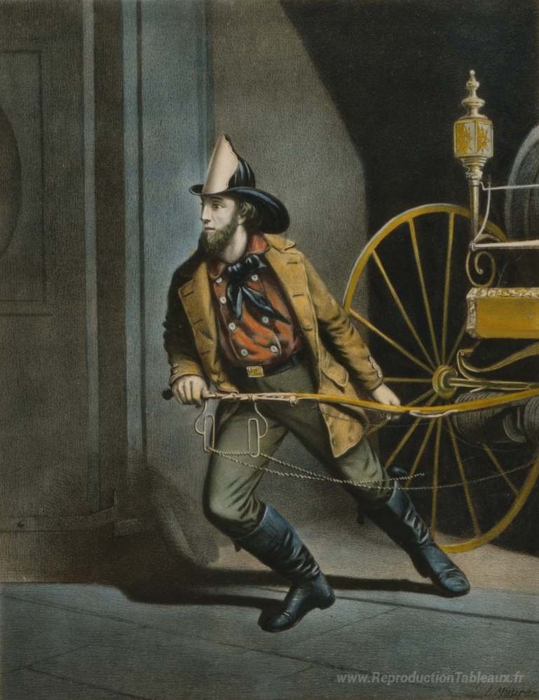 Nous vous proposons une reproduction artisanale sur toile du célèbre tableau 'Le pompier américain. Toujours prêt' de Currier and Ives, provenant du Musée de la Reproduction.