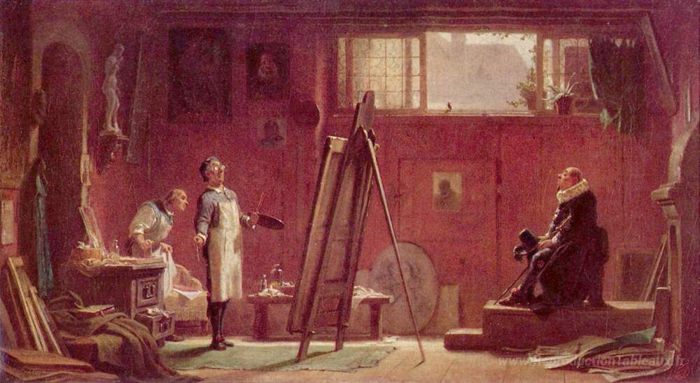 Nous vous proposons une reproduction artisanale sur toile du célèbre tableau 'Le portrait peintre' de Carl Spitzweg, provenant du Musée de la Reproduction.