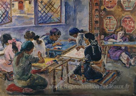 Nous vous proposons une reproduction artisanale sur toile du célèbre tableau 'Le premier groupe de Bakhchisarai' de Pyotr Konchalovsky, provenant du Musée de la Reproduction.