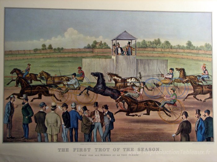 Nous vous proposons une reproduction artisanale sur toile du célèbre tableau 'Le premier trot de la saison' de Currier and Ives, provenant du Musée de la Reproduction.