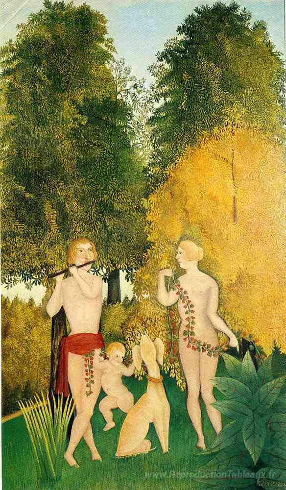 Nous vous proposons une reproduction artisanale sur toile du célèbre tableau 'Le quatuor heureux' de Henri Rousseau, provenant du Musée de la Reproduction.