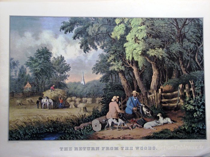 Nous vous proposons une reproduction artisanale sur toile du célèbre tableau 'Le retour des bois' de Currier and Ives, provenant du Musée de la Reproduction.