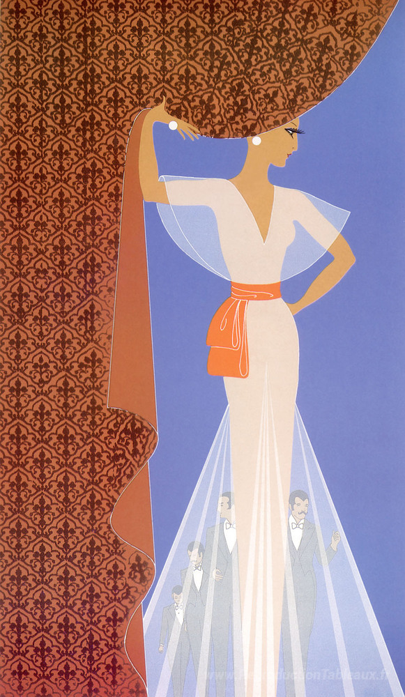 Nous vous proposons une reproduction artisanale sur toile du célèbre tableau 'Le rideau' de Erte, provenant du Musée de la Reproduction.