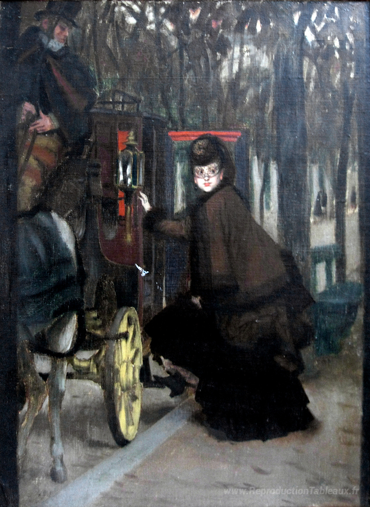 Nous vous proposons une reproduction artisanale sur toile du célèbre tableau 'Le Secret Rendez Vous' de James Tissot, provenant du Musée de la Reproduction.