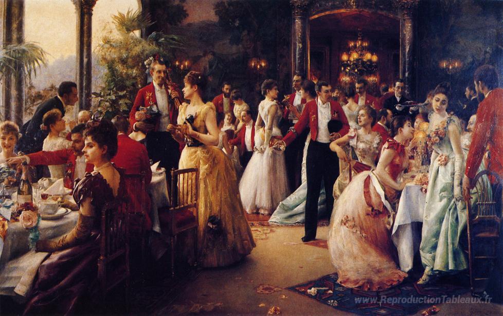 Nous vous proposons une reproduction artisanale sur toile du célèbre tableau 'Le souper de chasse' de Julius LeBlanc Stewart, provenant du Musée de la Reproduction.