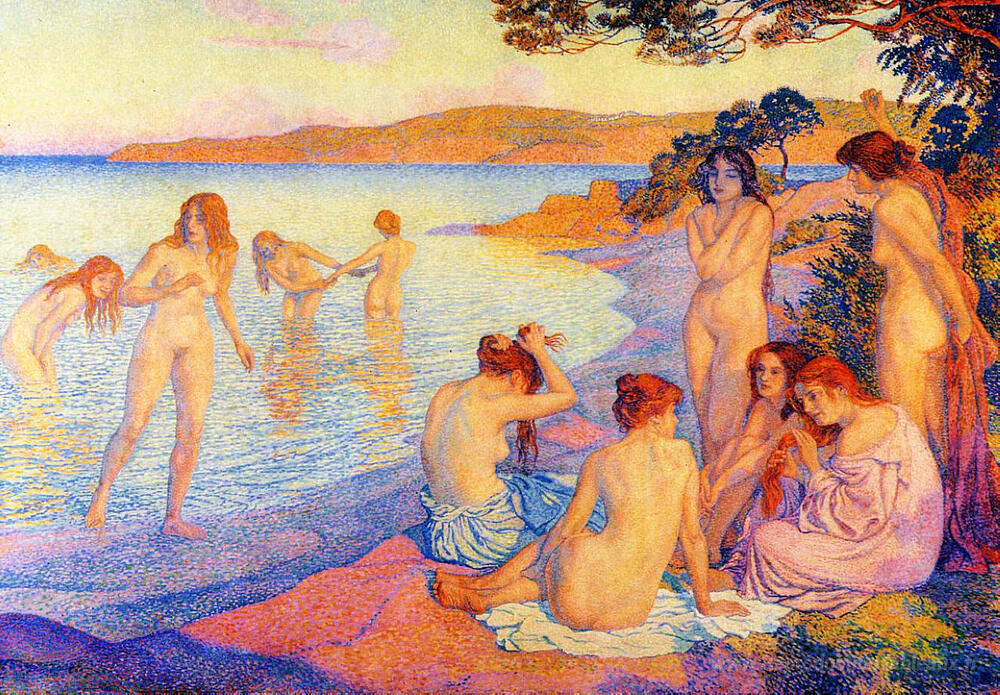 Nous vous proposons une reproduction artisanale sur toile du célèbre tableau 'Le temps de brûlure' de Theo van Rysselberghe, provenant du Musée de la Reproduction.