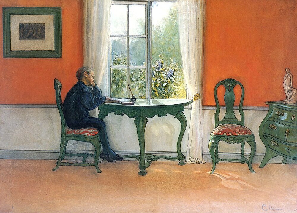 Nous vous proposons une reproduction artisanale sur toile du célèbre tableau 'Lecture requise' de Carl Larsson, provenant du Musée de la Reproduction.