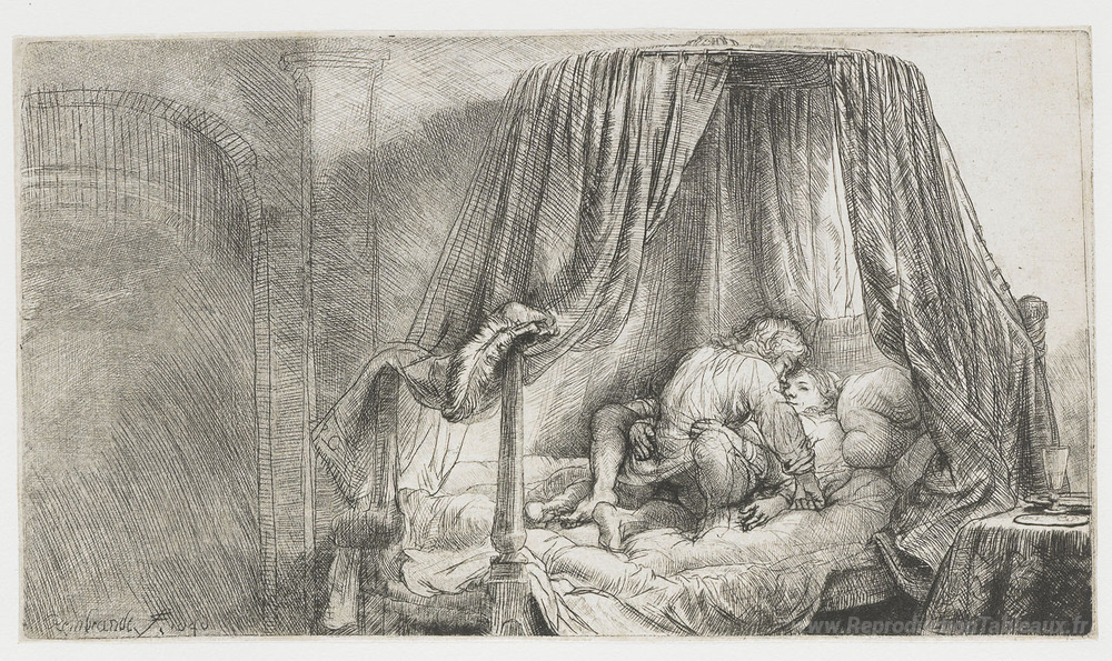 Nous vous proposons une reproduction artisanale sur toile du célèbre tableau 'Ledikant' de Rembrandt, provenant du Musée de la Reproduction.