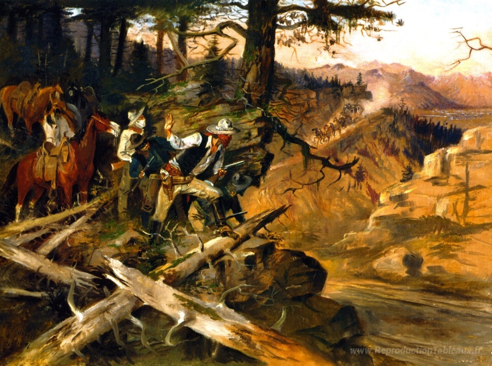 Nous vous proposons une reproduction artisanale sur toile du célèbre tableau 'L'embuscade' de Charles M. Russell, provenant du Musée de la Reproduction.