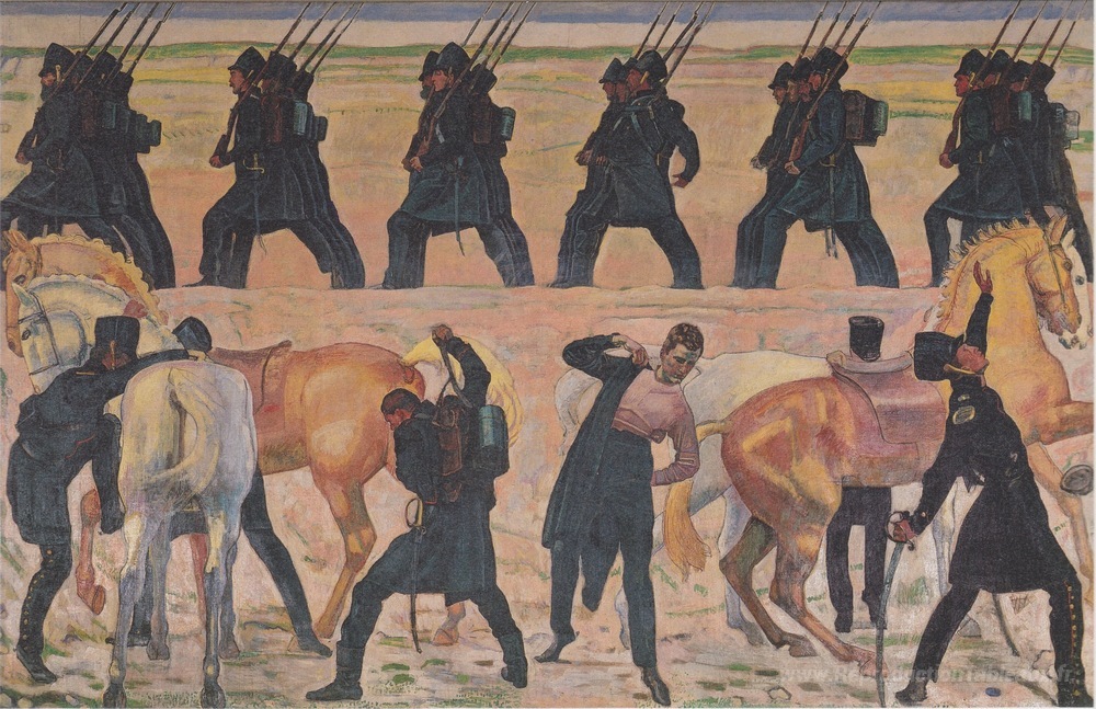 Nous vous proposons une reproduction artisanale sur toile du célèbre tableau 'Les étudiants allemands dans la guerre de libération de 1813' de Ferdinand Hodler, provenant du Musée de la Reproduction.