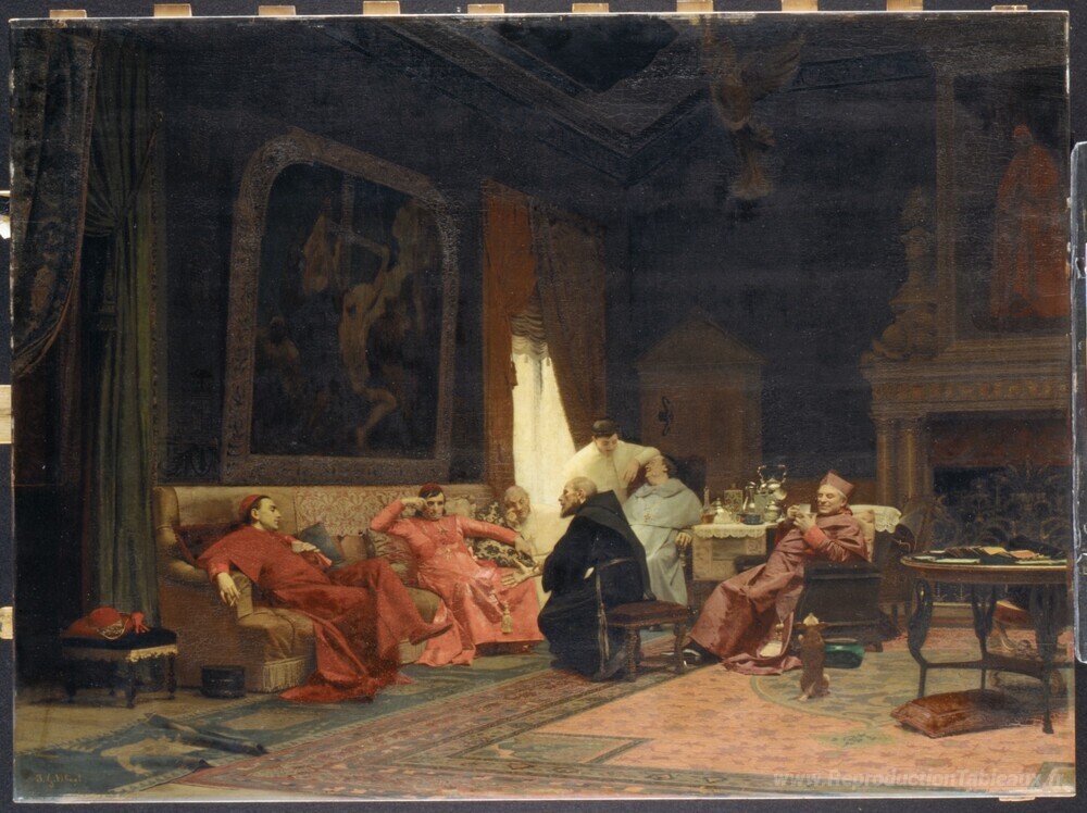 Nous vous proposons une reproduction artisanale sur toile du célèbre tableau 'Les aventures du missionnaire' de Jehan Georges Vibert, provenant du Musée de la Reproduction.