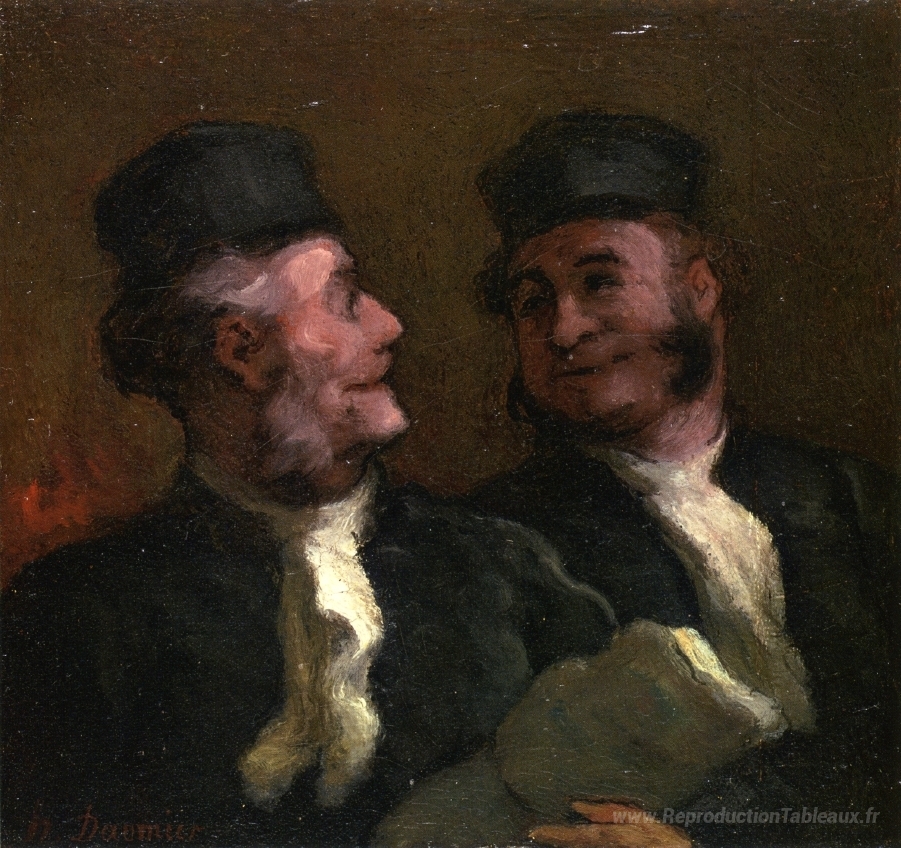 Nous vous proposons une reproduction artisanale sur toile du célèbre tableau 'Les avocats' de Honore Daumier, provenant du Musée de la Reproduction.