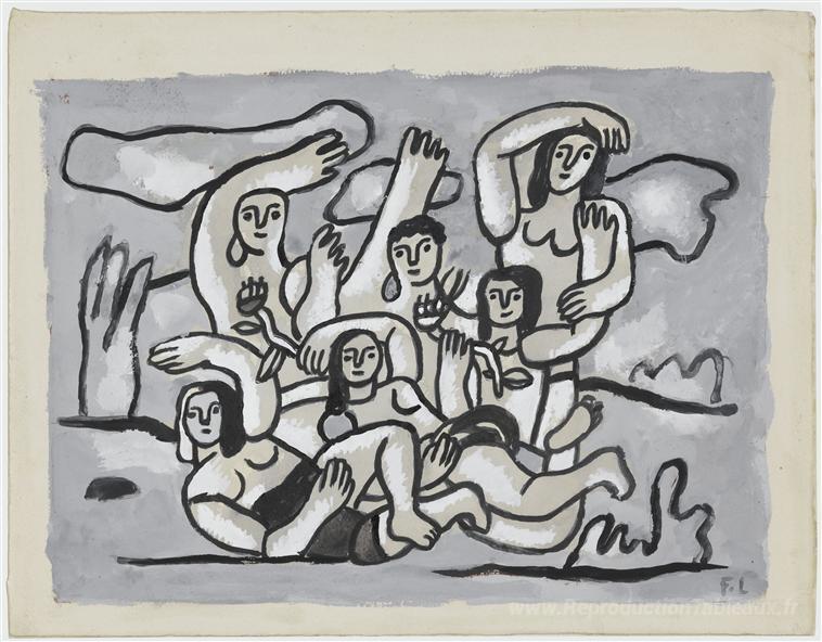 Nous vous proposons une reproduction artisanale sur toile du célèbre tableau 'Les baigneurs' de Fernand Leger, provenant du Musée de la Reproduction.