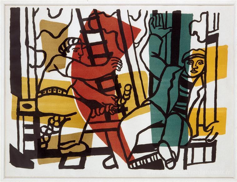 Nous vous proposons une reproduction artisanale sur toile du célèbre tableau 'Les constructeurs (couleur extérieure)' de Fernand Leger, provenant du Musée de la Reproduction.