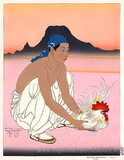 Nous vous proposons une reproduction artisanale sur toile du célèbre tableau 'Les deux adversaires (à gauche). Noyau' de Paul Jacoulet, provenant du Musée de la Reproduction.