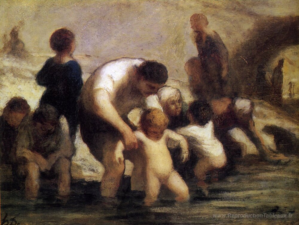 Nous vous proposons une reproduction artisanale sur toile du célèbre tableau 'Les enfants avec le bain' de Honore Daumier, provenant du Musée de la Reproduction.