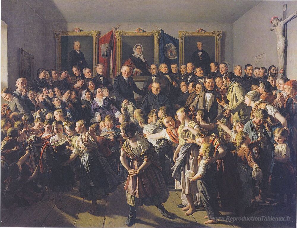 Nous vous proposons une reproduction artisanale sur toile du célèbre tableau 'Les enfants de parents pauvres reçoivent des vêtements d'hiver d' de Ferdinand Georg Waldmüller, provenant du Musée de la Reproduction.