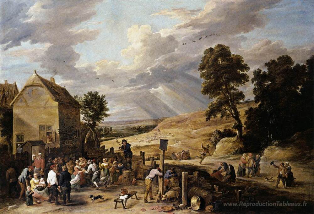 Nous vous proposons une reproduction artisanale sur toile du célèbre tableau 'Les paysans dansant à l'extérieur d'une auberge' de David Teniers the Younger, provenant du Musée de la Reproduction.