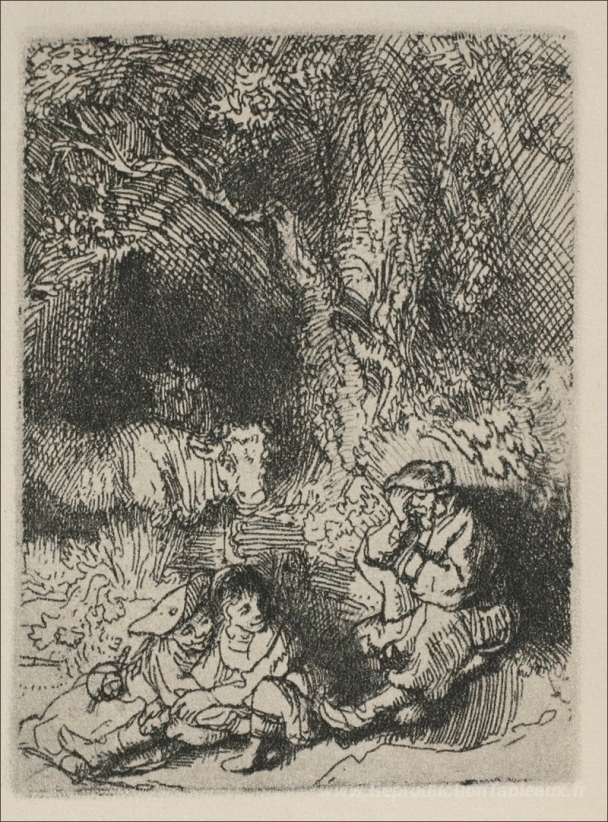 Nous vous proposons une reproduction artisanale sur toile du célèbre tableau 'Les Shepards et la famille' de Rembrandt, provenant du Musée de la Reproduction.