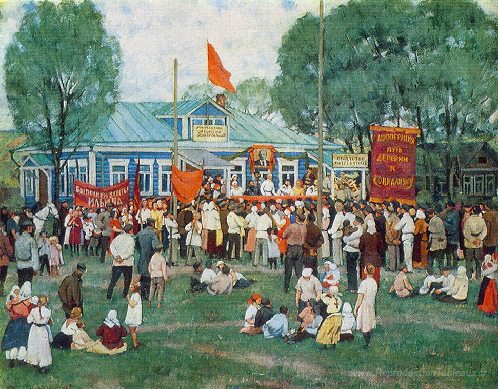 Nous vous proposons une reproduction artisanale sur toile du célèbre tableau 'Les vacances de coopération dans la campagne' de Konstantin Yuon, provenant du Musée de la Reproduction.