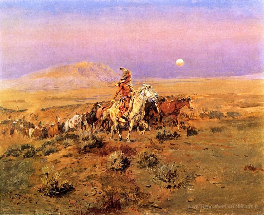 Bienvenue dans notre galerie dédiée aux reproductions d'œuvres d'art, où chaque toile est une invitation à l'évasion et à l'émerveillement. Parmi nos pièces phares, Les voleurs de chevaux de Charles M. Russell se distingue par son émotion brute et son dynamisme captivant. Russell, maître de la peinture de l'Ouest américain, capture ici l'essence aventureuse de la conquête des grands espaces, tout en mettant en lumière des scènes de la vie quotidienne des cowboys et des Indiens d'Amérique.