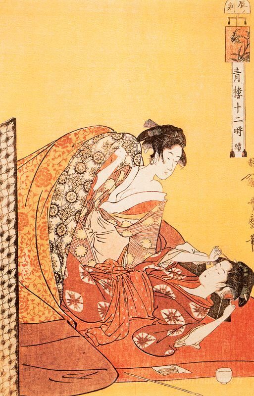 Nous vous proposons une reproduction artisanale sur toile du célèbre tableau 'L'heure du dragon' de Kitagawa Utamaro, provenant du Musée de la Reproduction.