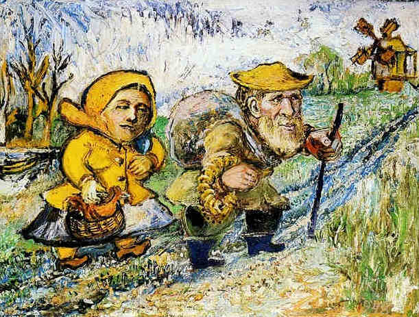 Nous vous proposons une reproduction artisanale sur toile du célèbre tableau 'Lié au moulin' de David Burliuk, provenant du Musée de la Reproduction.