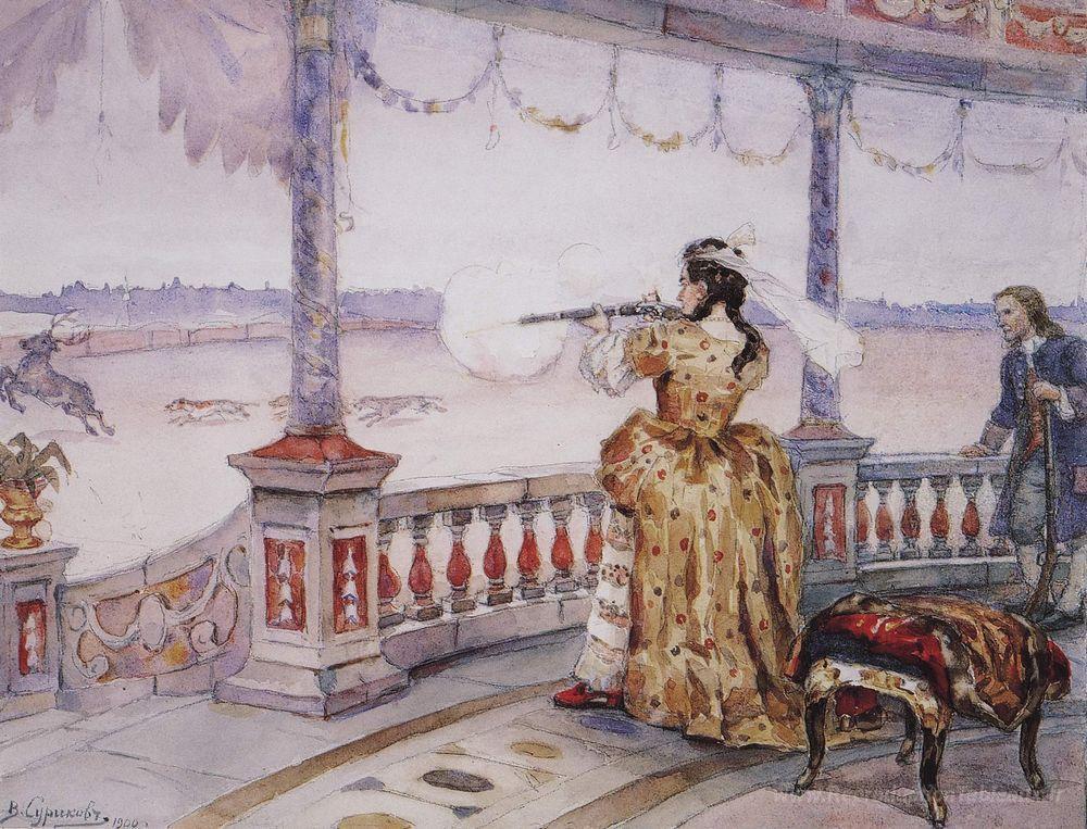 Nous vous proposons une reproduction artisanale sur toile du célèbre tableau 'L'impératrice Anna Ioannovna dans le temple Peterhof tire des ce' de Vasily Surikov, provenant du Musée de la Reproduction.