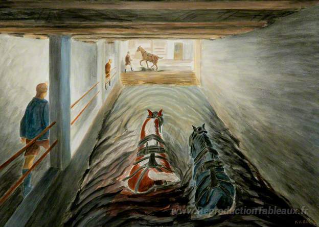 Nous vous proposons une reproduction artisanale sur toile du célèbre tableau 'Lowse, fin du quart' de Oliver Kilbourn, provenant du Musée de la Reproduction.