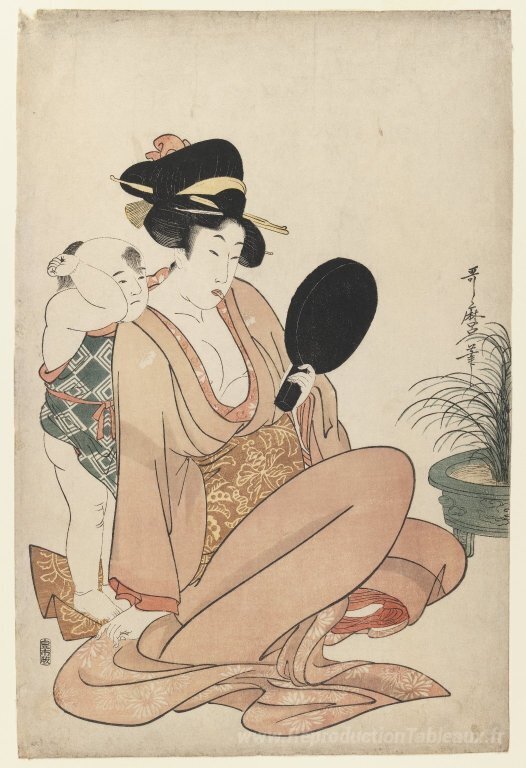 Nous vous proposons une reproduction artisanale sur toile du célèbre tableau 'Mère et enfant regardant un miroir à main' de Kitagawa Utamaro, provenant du Musée de la Reproduction.