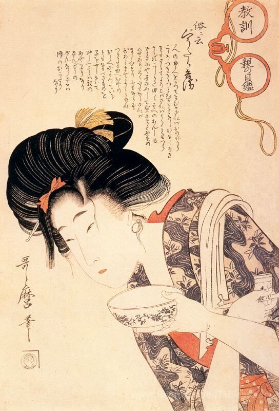 Nous vous proposons une reproduction artisanale sur toile du célèbre tableau 'Mère et fille de la classe moyenne' de Kitagawa Utamaro, provenant du Musée de la Reproduction.